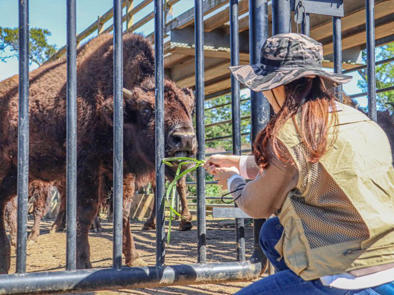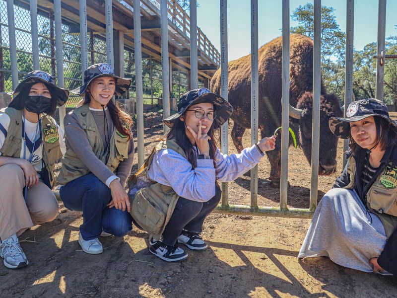 體驗過程包含搭乘『草原歷險車』進入野生動物王國遛答、美洲野牛習性解說與互動餵食;帶你超近距離感受『北美霸主』呆萌的另一類面貌;是樂齡、幼童皆適合的全齡層友善體驗。